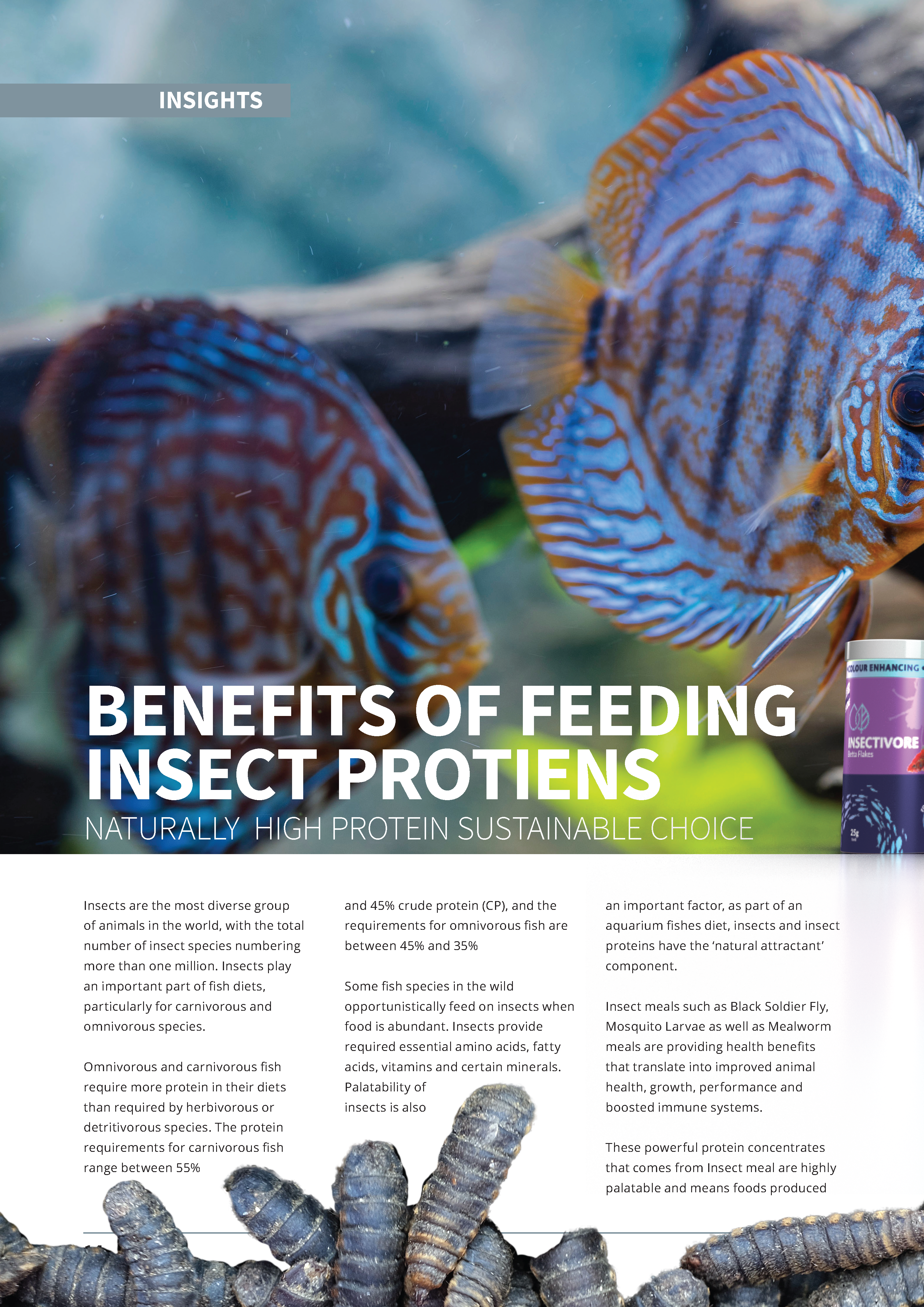 Some fish species in the wild opportunistically feed on insects whenfood is abundant. Insects provide required essential amino acids, fatty acids, vitamins and certain minerals. Palatability of insects is also an important factor, as part of an aquarium fishes diet, insects and insect proteins have the ‘natural attractant’ component.
